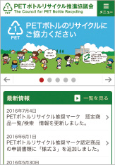 PETボトルのリサイクル推進に関して、幅広く情報共有を図るため、スマートフォン利用者へもスマートフォン専用画面にて対応しています。