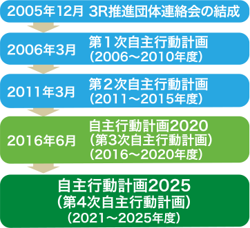 推進協議会は、3R推進団体連絡会の一員として「容器包装3R推進のための自主行動計画」に基づき、自主行動計画2020(第3次自主行動計画(2016年度~2020年度))を策定し取り組みを進めてきました。