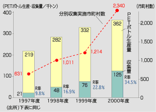 | PETボトルのリサイクルは、容器包装リサイクル法のもとに進められています。 もともとゼロからの出発で、モデル回収事業、モデル再商品化施設、再生用途の開拓等々PETボトル協議会が中心となり、10年前から取り組んできました。 1997年からは、容器包装リサイクル法によって、ごみの減量化と資源の有効利用を図る循環型社会構築に向けた全国的な取り組みへと変わってきました。同法の施行後は、PETボトルのリサイクル事業は順調に進んでいます。 その進捗状況を右図と下表に整理しました。PETボトルの分別収集量と生産量の比率をリサイクル率(R率)として示してあります。 法律施行前は一桁に過ぎなかったリサイクル率が、ここ数年は年々急増して、2000年度には34.5%に達しました。極めて順調にリサイクル事業が進んでいることがわかります。 また同時にPETボトルの分別収集を実施している市町村数も2,340となり (2001年3月末現在)、全国市町村数の72.5%まで増加してきました。 |