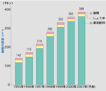 | 1977年にしょうゆ用としてPETボトルが初めて利用されて以来、20余年でPETボトル用樹脂の生産量は年間362千トン※1)に成長してきました。 特に近年の伸びは順調で、1995年以降は一貫して増加傾向にあります。最近の増加要因は、清涼飲料用の伸びによるものです。 指定PETボトルの用途は、清涼飲料用、しょうゆ用、酒類用で、識別表示※2)が義務づけられています。 |