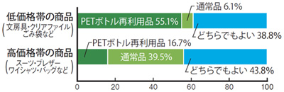 同品質、同価格商品で、通常品とPETボトル再利用品のどちらか1つを購入する場合、どちらを購入しますか?低価格帯、高価格帯それぞれの場合でお答えください。
