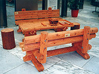 「かながわ木づかい運動」の一環として、間伐材を利用して作られた机と椅子 |