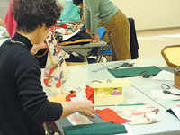 | リサイクル教室の作業風景 (和服の布のパッチワークでミニバッグ作り) |
