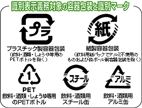 平成13年4月からプラスチック製容器包装と紙製容器包装の識別表示が義務化され、2年の猶予期間を経て平成15年4月より完全実施となりました。