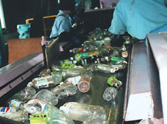 1998年3月に竣工された南部リサイクルセンター(川崎区夜光)では『資源物の日』に出されたPETボトル、空き缶、空きびんが搬入・処理されています。ひっきりなしにベルトコンベアを流れるPETボトルなどが手際よく選別されていました。2003年度は年間2,700トンのPETボトルを処理する計画です。 |