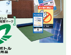 ここに紹介している製品はPETボトル協議会が2002年7月から2003年3月末までに新たに「PETボトルリサイクル推奨マーク」の使用を認定した再商品化製品です。このマークを目印にPETボトルの再商品化製品の積極的なご利用をお願いいたします。