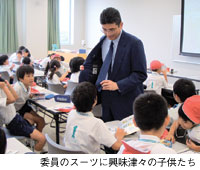 講座に飛び入り参加した当協議会の委員が、自分の着ているスーツやワイシャツ、ネクタイが約30本分のPETボトルの再生品であることを説明すると、「えぇ〜」と驚き、手で触ったりするなど、興味津々の様子でした。