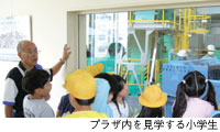 リサイクルプラザの「プラザ棟」には、再生工房室、情報発信コーナーなどが整備されています。見学に来る小学生は、山積みにされたPETボトルや手選別作業の現場、PETボトルの再利用品などに驚きの声をあげ、パソコンを使った「分別クイズ」では楽しみながらリサイクルの大切さを学びます。