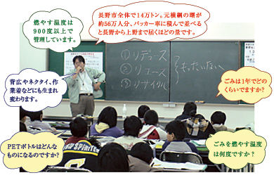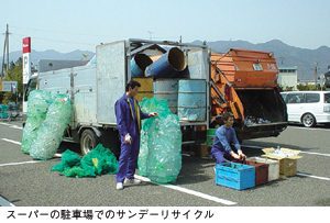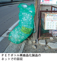 雄大な千曲川が流れる長野市は人口38万人。PETボトルの分別回収は1996年から始まりました。PETボトルは市内約3,500ヵ所の集積所に用意されたPETボトル専用の緑色のネット(PETボトル再商品化製品)に月2回排出されます。専用のパッカー車で単品収集しています。2004年度の回収量は約726トンです。排出に際しては、・キャップとラベルを取り ・中をすすいで ・つぶして出すようにお願いしています。「PETボトルの回収を始めて10年近く経っているので、この方法はかなり定着しています。キャップやラベルもきちんとはずしていただいています」と竹村係長は語ります。 長野市では、家庭のごみを出す指定袋は、市から毎年1冊配られるチケットと引き換えに購入します。一世帯につき年間200枚まではスーパーなど小売店で購入できますが、足りない場合は、市の窓口でごみ処理手数料を含めた価格で追加購入する二段階方式です。袋の枚数を制限することで、ごみの排出量を意識してもらい、減量への協力と資源のリサイクルを呼びかけています。 さらに、市では「サンデーリサイクル」を行っています。これは日曜日の10:00〜13:00まで、スーパーの駐車場に収集車を派遣し、家庭から出たPETボトル、びん、缶などの拠点回収です。定期回収(朝8時まで)に出せなかったものを、買い物ついでに出せるようにしています。(2004年度は約10kg入りのネットで1,482袋のPETボトルを回収。)2004年には、長野市清掃センターに「プラスチック製容器包装圧縮梱包施設」が完成しました。1日の処理能力は、PETボトルとプラスチック製容器を合わせて20トン。ベールの状態で、(財)日本容器包装リサイクル協会のルートに処理委託しています。