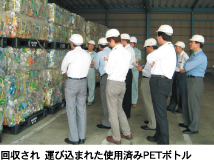 | PETボトルの年間処理能力は4195トン。今年の落札量は4172トンと、幸いにして処理能力に見合った量のPETボトルを確保できました。工場に運び込まれた使用済みPETボトルは、丁寧な手選別、数回にわたる水洗浄といった処理を経て再生フレークになります。工場全体が、エコを意識したシステムになっており、洗浄に使われた水は、排水処理設備を経て再び洗浄水に使用される徹底ぶりです。市町村担当者からの見学申し込みは随時受け入れていますが、作業現場は危険なので、小学生の見学は残念ながらお断りをしています。 |