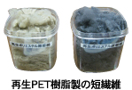 もう一つの顔である合成繊維メーカーとして、この工場では、PETボトルの再生フレークから短繊維を生産し、主に顔料を練り込んだ耐光性の高い、少量多品種生産をコンセプトに、高度な製糸技術で、製品ごとの用途に対応できるさまざまな太さの糸を生産しています。また、原着綿の色合わせは、小山化学が世界一と自信を持つ技術でありプライドでもあります。その品質の高さが認められ、自動車内装材をはじめとしたさまざまな産業資材として幅広く利用されています。