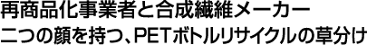 小山化学株式会社は、1968年に操業を開始しました。北関東の表玄関である栃木県小山市にPETボトルリサイクル工場を持ち、PETボトル再商品化事業者と、合成繊維メーカーという二つの顔を持っています。同社は、容器包装リサイクル法が施行される以前から、PETボトルリサイクルに取り組んできた、まさに草分け的存在です。 |