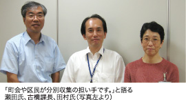 環境清掃部の古橋課長の説明によると、「PETボトルの回収を町会にお願いすることにしたのは、町会の集団回収で回収したびん・缶は区が回収していた頃と比べて、明らかに綺麗なものがしっかりと分別されていたからです。」とのこと。「集団回収は、町会や区民が分別を担い、正しく分別された資源を収集事業者へ引き渡すことにより区から報奨金が支給される仕組みなので、自ずと綺麗なものが、しかもきっちりと分別されて集まるようになるのです。」と補足してくださいました。