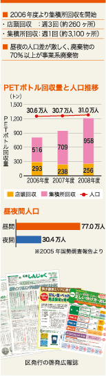 こうした中で改めて注目されるのが、活発な3R推進活動。現在、区では「ごみ半減、資源倍増」をキャッチフレーズに、区を挙げてごみの総排出量の削減とリサイクルの促進に取り組んでいるところです。