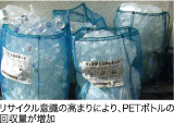 その新宿区が現在実施している使用済みPETボトルの回収は、他の廃棄物と同様に店頭回収と集積所回収の2種類に大別されます。先行したのは店頭回収で、スーパーやコンビニなどから回収されたPETボトルはそのまま東京ペットボトルリサイクル(株)に直接引き渡されていますが、異物の混入も少なく、キャップやラベルもほとんどがはずされ、また汚れも目立たないようです。