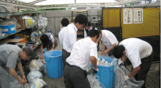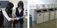 その中でも大切な活動が、徹底的なごみの分別です。教室内にはごみ箱がなく、学年に2ヶ所ある9分別のゴミステーションに分別排出し、資源になるものをリサイクル事業者に引き渡しています。しかし、ちゃんと分別されていないものは引き取ってもらえず、可燃ごみになってしまうので、ISO委員会の担当生徒が、週1回、回収ごみの徹底的な分別を行います。可燃ごみの回収袋を開け、その中に混ざっている紙やプラスチックなどの資源物を出したり、逆に資源物に混ざった可燃ごみを戻すなど、ごみを減らすことに大変な努力をしています。昼食後のごみが一番プラスチックの混入率が高く、「特に多く混ざっているのが部活と職員室からでるごみですよ。」とのこと。