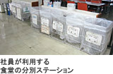 ここ湘南工場をはじめ、自社工場である舞鶴工場でも廃棄物をすべて再生利用しており、再資源化率100%を達成。同じ可燃物でも割り箸と紙ごみを分けるなど、見学した食堂の分別ステーションでも30種類に分別しています。