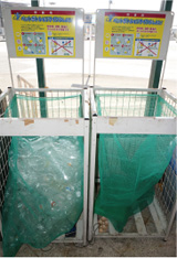 千葉県内で市原市のリサイクル率に遅れが出ている状況を改善したいという考えから、2012年10月から従来市内36ヶ所の拠点回収のみだった、使用済みPETボトルの回収方法を変更。新たに約7,600ヶ所のごみステーションでも、資源物としての分別収集を開始しました。収集方法の変更にともない、資源物の収集日を増やし月2回から週1回に。ステーション収集では、市から支給された0.3m3ほどの青いネットに、キャップ・ラベルを外し、中を洗い、乾かしてつぶして出すようお願いしています。