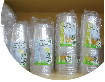 レジャーなど暮らしのさまざまなシーンで目にする、プラスチック製や紙製のトレーやカップ、紙ナプキンなどの行楽用品の中で、「環境良品®」というシリーズを展開し、再生PETや間伐材を使用した商品を取り扱っています。