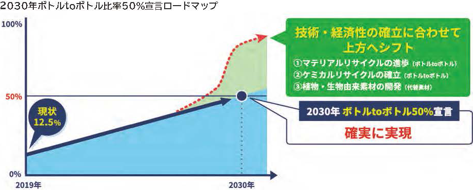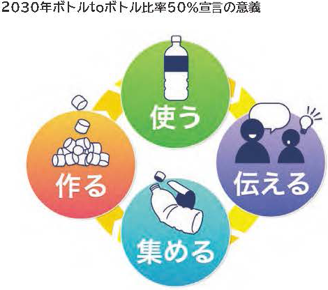 「ボトルtoボトル」の推進は、地上にすでにある資源の再活用であり、化石由来資源の削減とCO₂の削減に寄与することが可能となります。今回の「2030年ボトルtoボトル比率50%宣言」は、現状の技術と経済性に基づいた宣言です。将来的には、「マテリアルリサイクル技術の進歩」と「ケミカルリサイクルの確立」を通じてより高い「ボトルtoボトルリサイクル比率」を目指します。