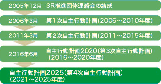 本連絡会は、「容器包装3R推進のための自主行動計画」に基づき、「事業者が自ら実践する容器包装3Rの取り組み」と「消費者・NPO、自治体・行政など主体間の連携に資するための取り組み」を進めてきました。取り組みの進捗状況は毎年度フォローアップし公表しています。また、計画の取り組み内容や目標の見直しは5年ごとに行っており、2021年度より第4次の自主行動計画となる自主行動計画2025となります。第3次自主行動計画である自主行動計画2020の取り組み実績や内外の動向を踏まえ、2025年度に向けた目標と取り組みの方向性を定めました。
