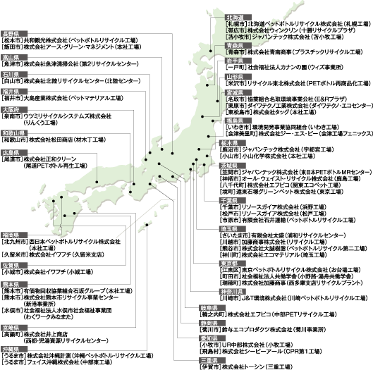 PETボトル再商品化施設一覧※(公財)日本容器包装リサイクル協会「令和3年度下期 登録再生処理事業者」(2021年5月21日)より
