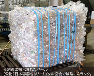 回収方法としては、ポリ袋を使用せず、戸建は各家庭で用意されたポリバケツ、集合住宅などでは市で貸与しているネットに入れる回収方法を採用しています。それにより回収時や中間処理過程での作業効率の向上、再商品化においても、異物低減となるため、高品質なベール(圧縮梱包)の提供に繋がっています。