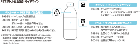 1993年に「再生資源の利用の促進に関する法律(再生資源利用促進法)」の政令改正により、PETボトルは第二種指定製品に指定され、飲料、しょうゆ、酒類用PETボトルには、識別マークの表示が義務付けられました。以後、技術革新を続け、また法の制定、改正に合わせ「指定PETボトルの自主設計ガイドライン」も常に改訂を実施してきました。