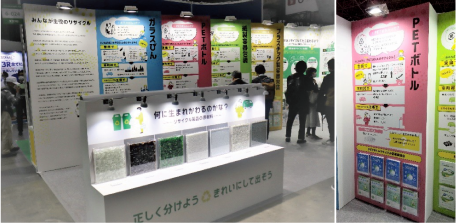 当推進協議会として、「エコプロ2022」(2022年12月7~9日、東京ビッグサイト)に日本容器包装リサイクル協会のブース内に会員会社として出展しました。初めての試みとして全面パネルによる表装展示方式により「正しく分けよう」「きれいにして出そう」の共通テーマのもとPETボトルは軽くすすぐ、ラベルやキャップは外して横から潰すなどの具体的な方法をわかりやすいフレーズにてPRいたしました。3日間のエコプロ入場者数は61,541人(2021年54,885人)うち子供団体は8,952人(2021年は6,007人)と昨年より増加しました。