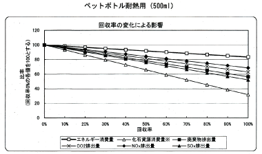 PETボトルは回収率が高くなるほど、エネルギー消費量、CO2排出量、NOx排出量、SOx排出量等の環境負荷が低減するとの調査結果があります。